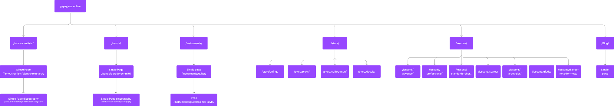 Definimos una arquitectura pensada para el recorrido del usuario según sus intereses: una homepage que actúa como portal al universo gypsy, una tienda que permite explorar por categorías artesanales, una sección educativa estructurada por nivel técnico, y fichas editoriales que narran la historia de artistas, bandas e instrumentos.