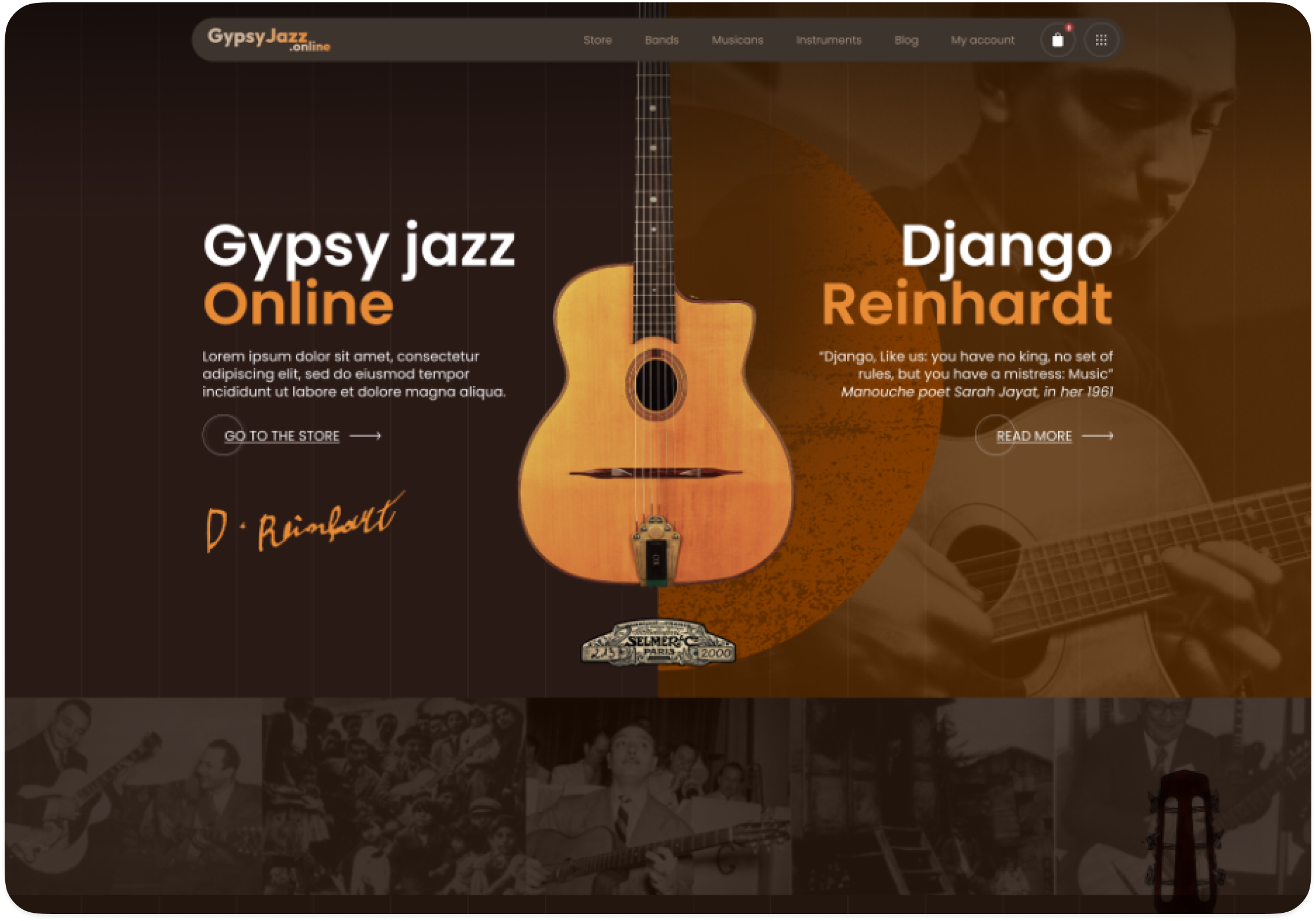 El gypsy jazz tiene una estética particular: es cálido, íntimo, artesanal. No podía parecer una tienda moderna con sliders fríos y botones llamativos. Opté por una paleta sobria, inspirada en escenarios de madera y terciopelo, y por una tipografía que evocara lo clásico sin caer en lo vintage forzado.